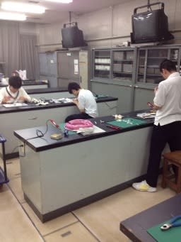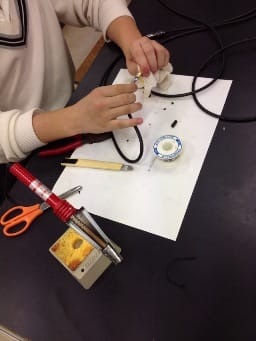 物理の先生にお願いして、物理実験室と半田ごて等一式をお借りし、シールド自作講座を行いました(希望者のみ)。一度自分で作っておけば、いざ断線したときにも自分で直せるようになります。