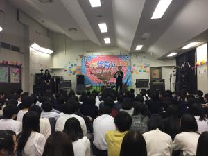 その「代官山ライブ初参加」の3か月後に、朋優学院高校のホールを用いて「軽音楽連盟発足記念ライブ」が行われます。そこで本校の44期生を中心とした「Red Points」というバンドが「東京都高等学校軽音楽連盟発足記念の歌」を作り、発足を寿ぎました。当時オリジナル曲を作るという文化が東京全体にも本校にも乏しかった時代に、本校の生徒が一生懸命「発足記念の歌」を作り、そして披露したのを当時の委員長(にしてこの第一商業顧問K先生)がとても喜んでくださったのをよく覚えています。